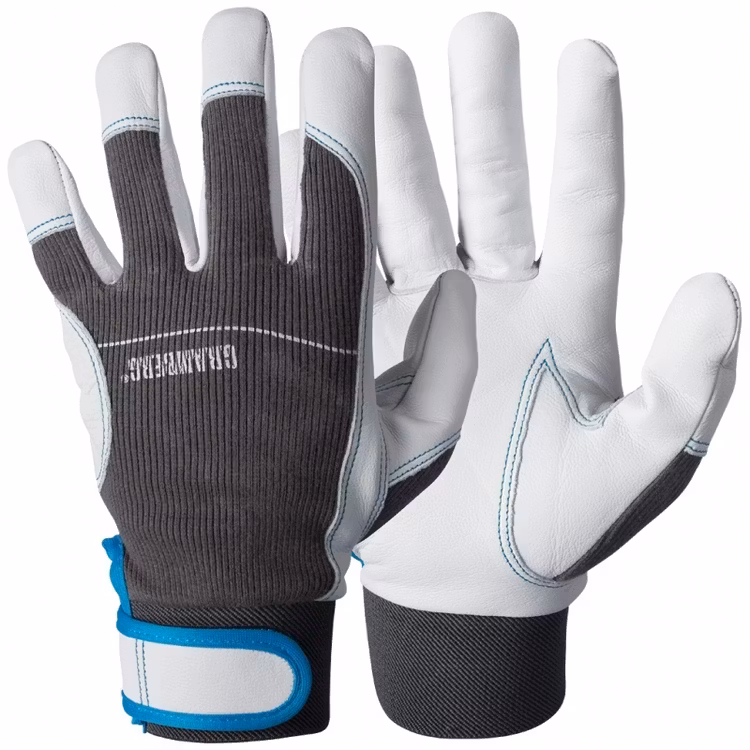 Montagehandskar i getnarv med ovanhand i elastisk bomull och kardborreknäppning. Ofodrade.